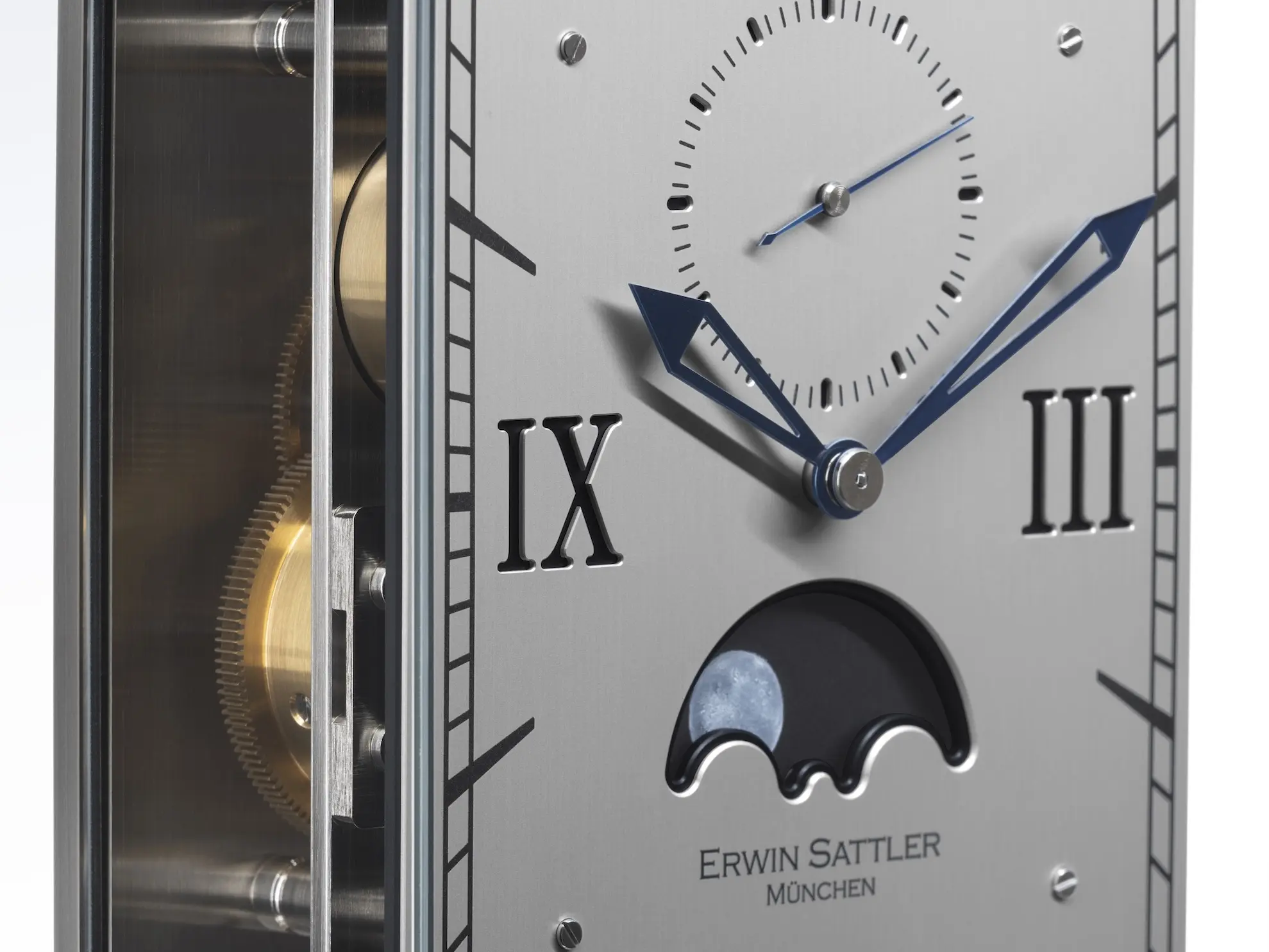 The Lunaris is also an acoustic delight. Every full hour is signaled by a simple strike on a bell in a so-called passenger chime. The winding mechanism, hands and moon phase setting as well as the 8-day clock setting are located on the back of the clock for convenient operation.