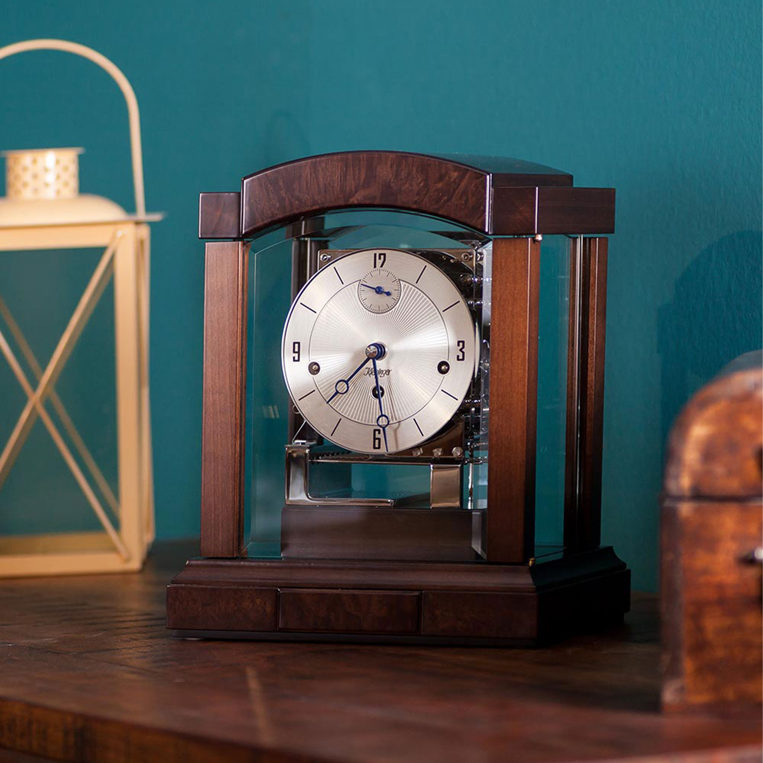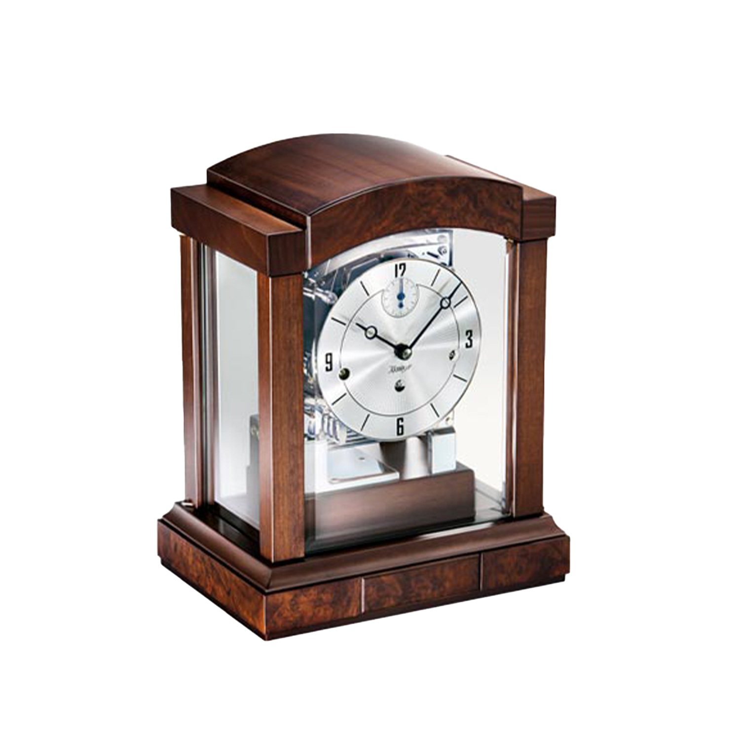 The modern table clock 1242-22-03 from Kieninger in dark walnut with burl wood is equipped with two doors, a drawer for the winding key and bevelled crystal glasses on the doors. The multifunction dial displays the seconds, date, day of the week, month and moon phase as well as milled Breguet hands.
