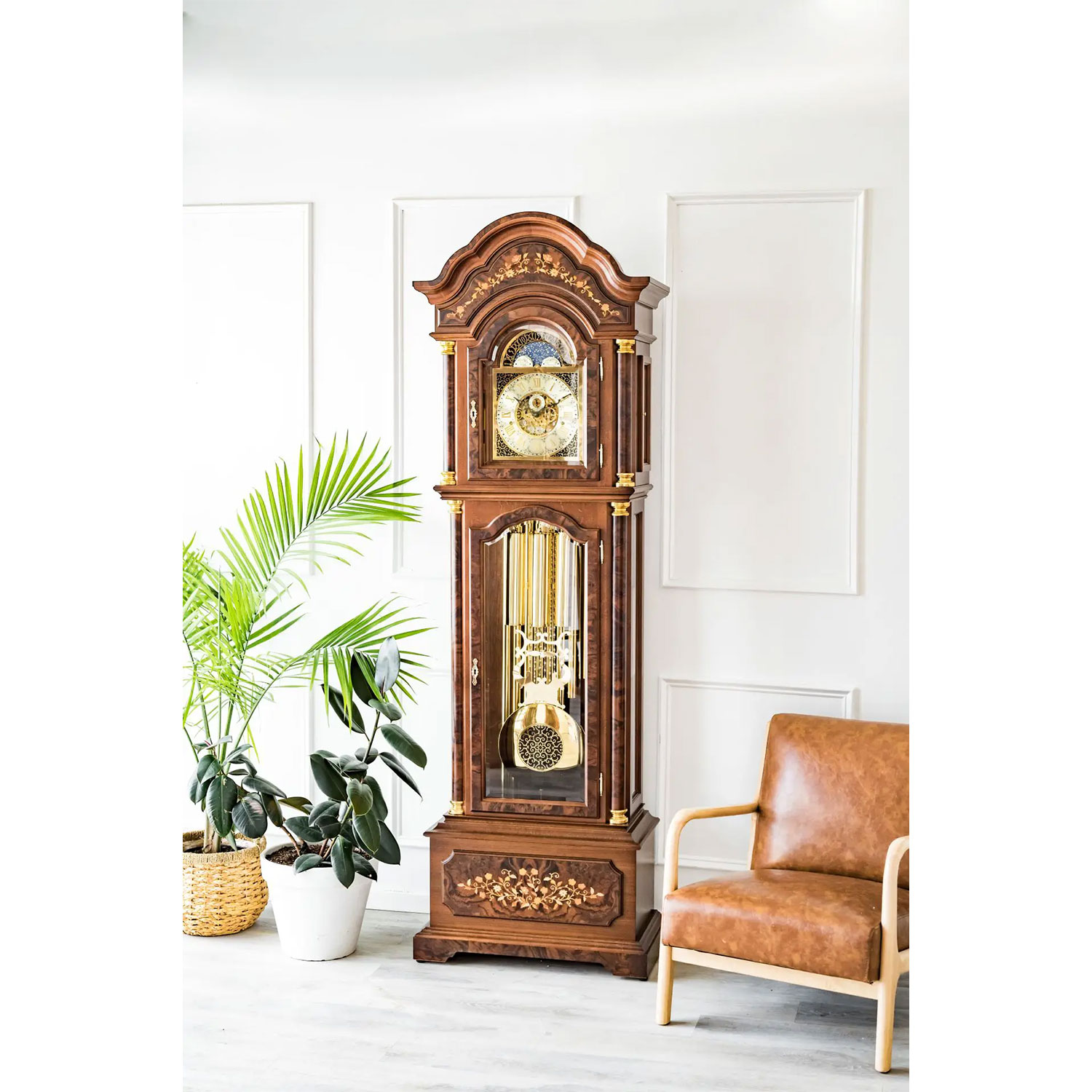 Die Hermle Standuhr 01210-031171 vereint klassische Eleganz mit hochwertiger traditioneller Uhrmacherkunst. Ihr Gehäuse besticht durch echte Intarsien und fein gearbeitete Wurzelholzeinlagen, die der Uhr eine warme, repräsentative Ausstrahlung verleihen. Die integrierte Mondphase auf dem Zifferblatt unterstreicht den klassischen Charakter dieser edlen Standuhr.