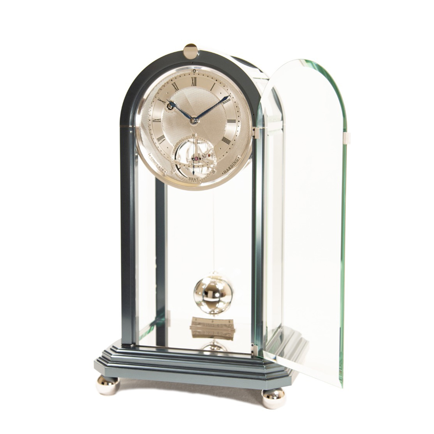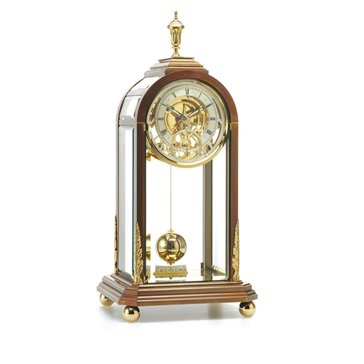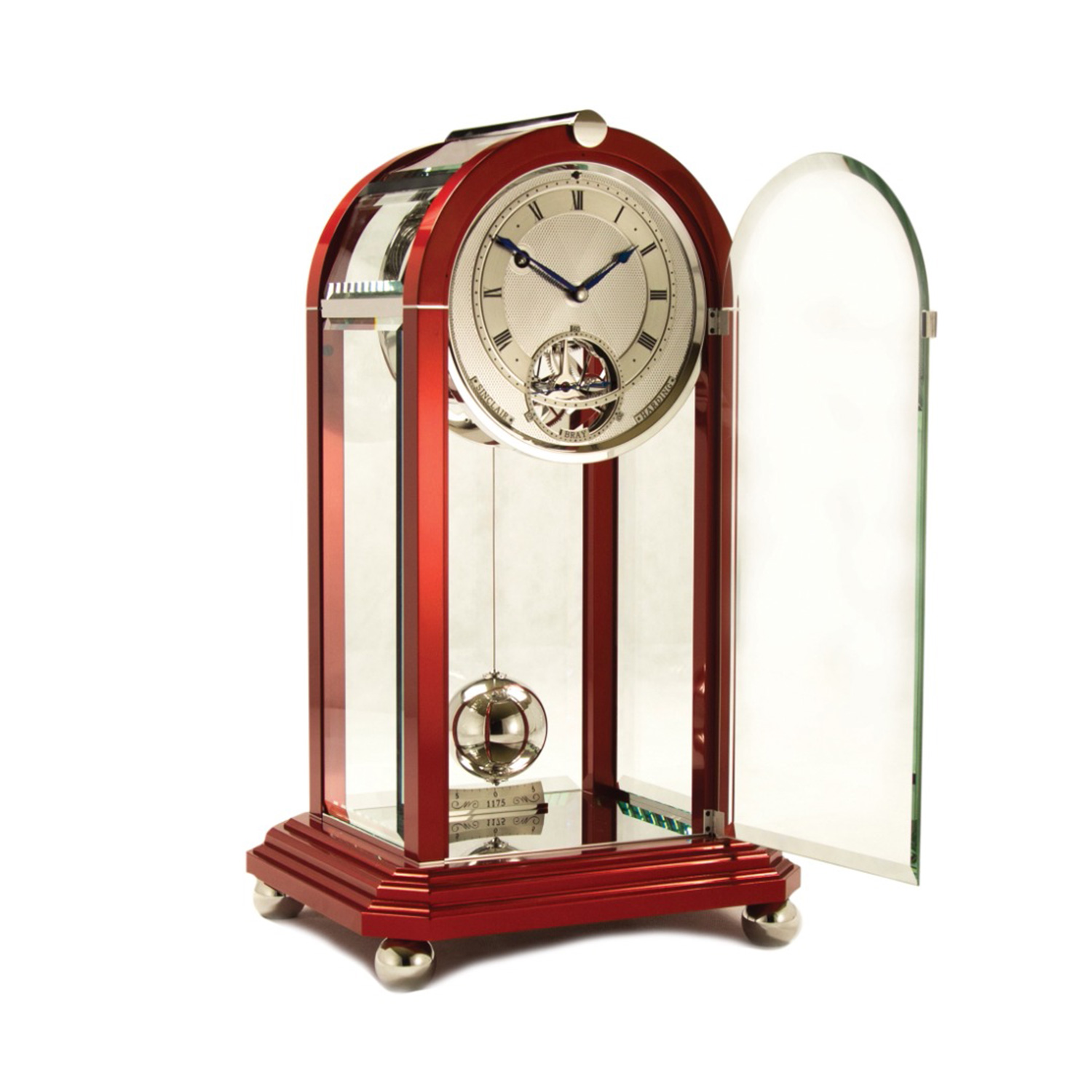 The table clock “Table Regulator” has a very solid 8-day movement that is controlled by an unusual spherical pendulum with a “high Q” that strikes the half second.