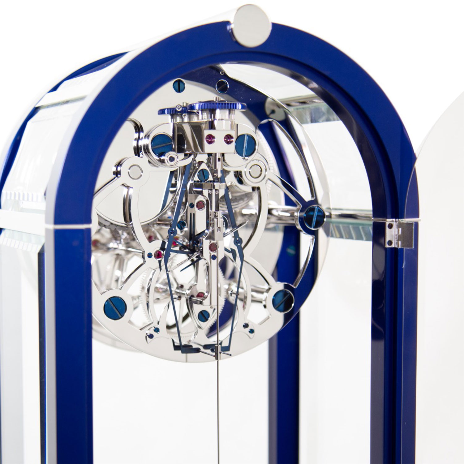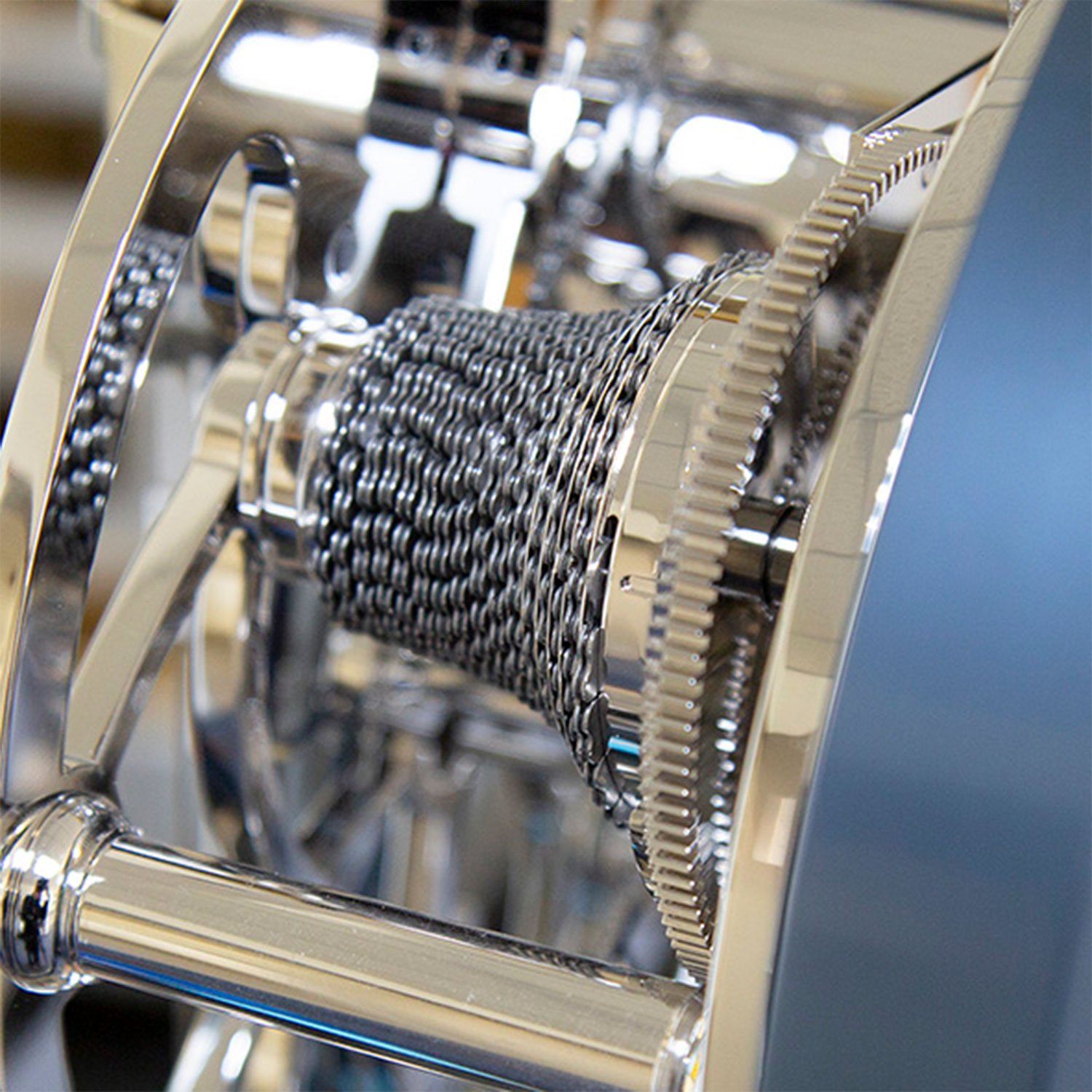 The case is made of aluminium, polished and hard anodized and finally finished with Renaissance wax. The beveled glass doors, which open to the front and back, are 6 mm thick. The side panels are also finished to provide an interesting view of the movement.