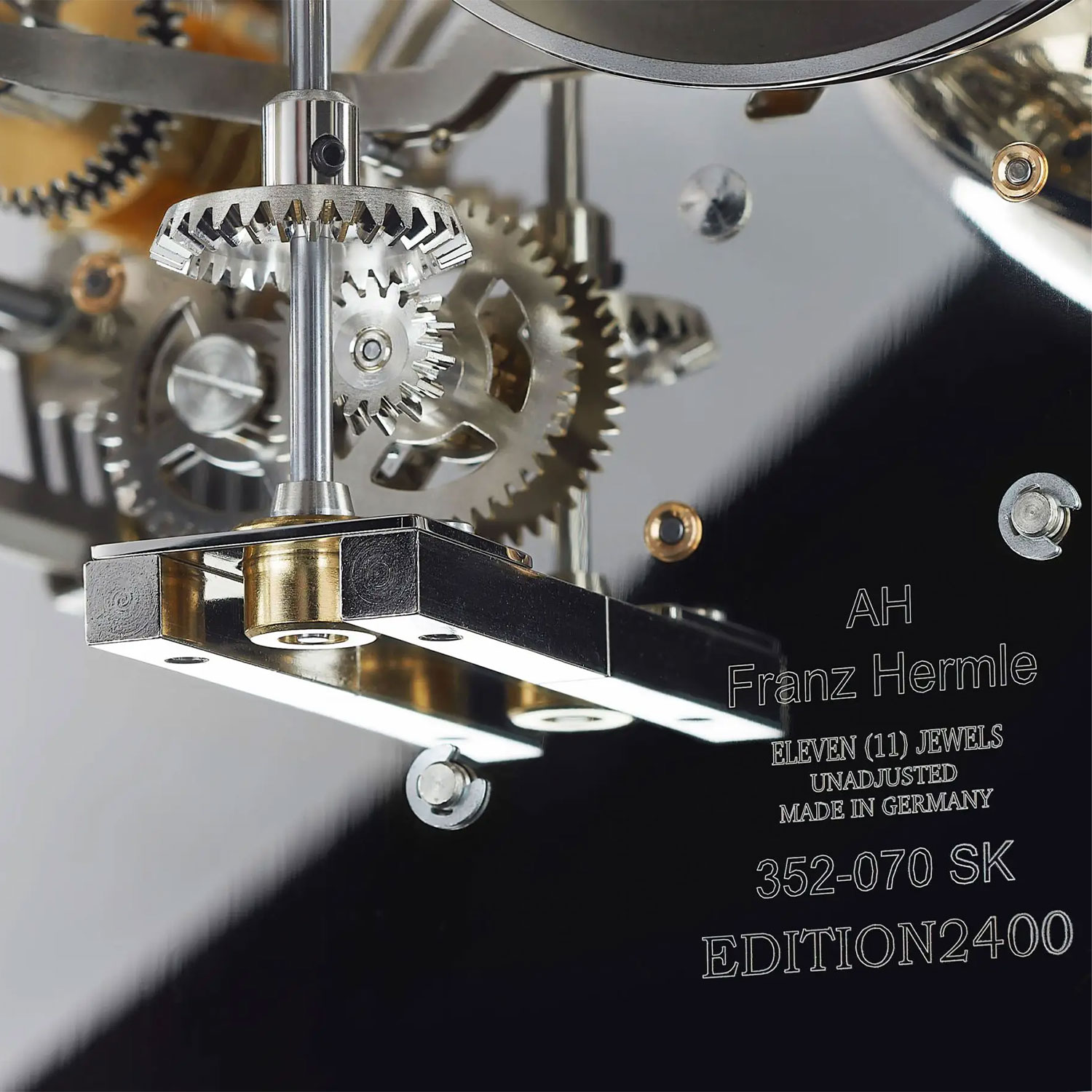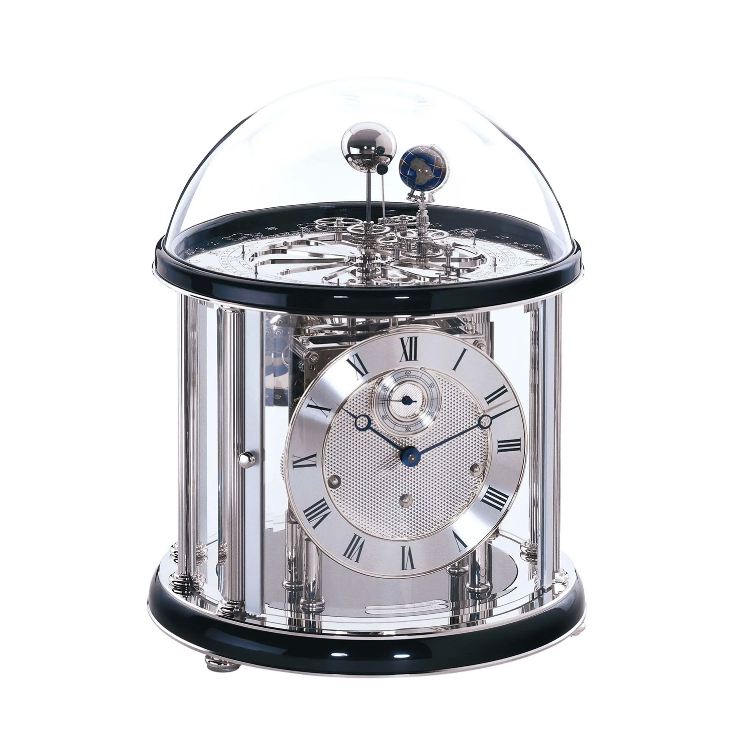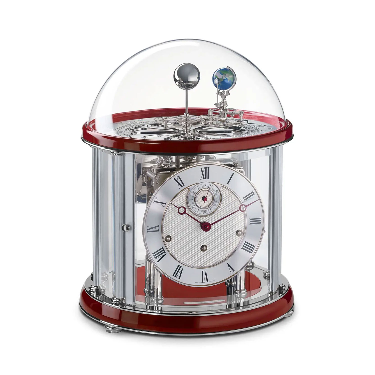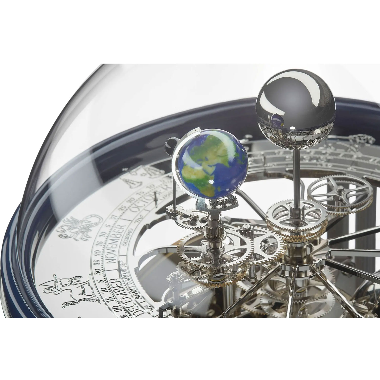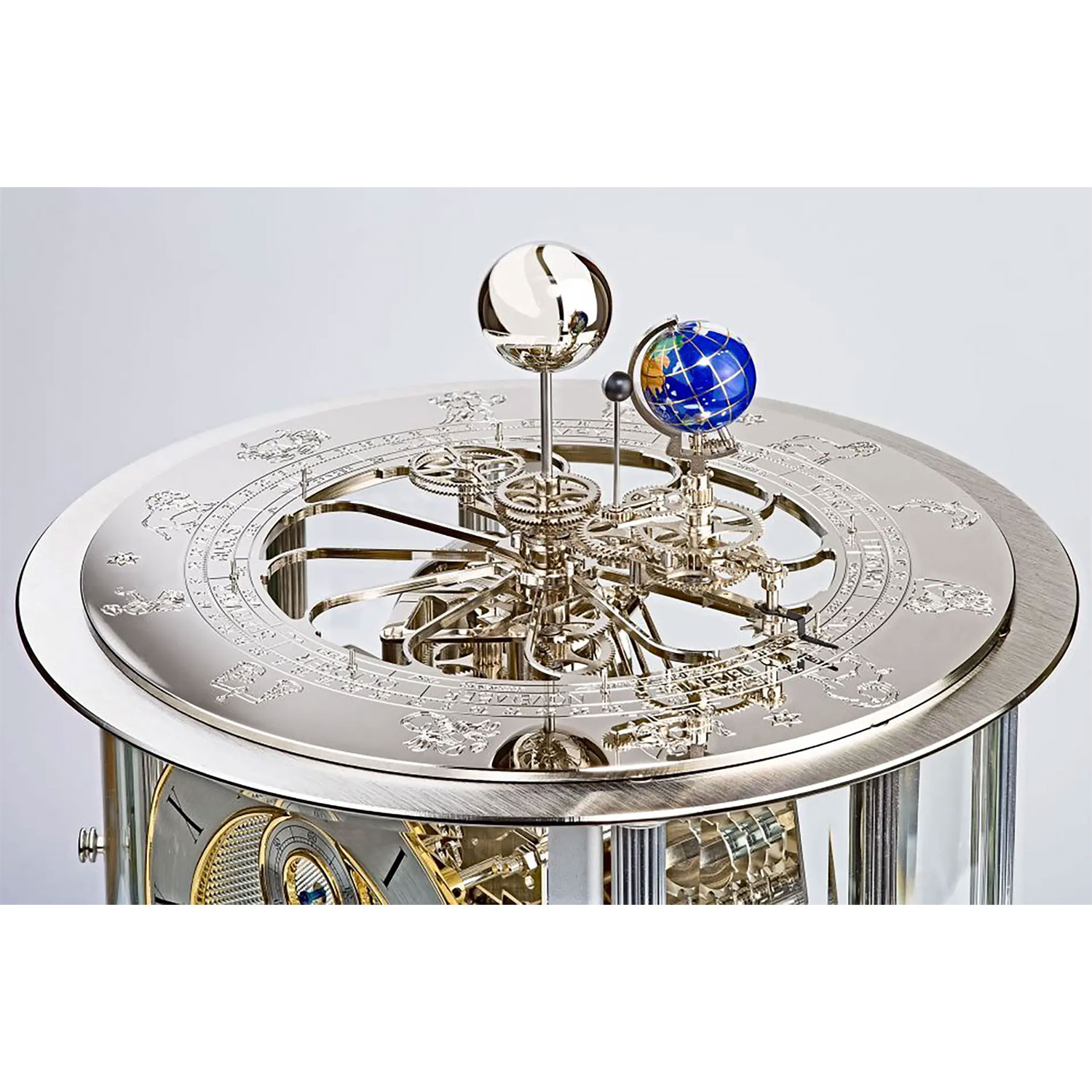 The Tellurium 22823-V10352 in chrome/green from Hermle shows the Earth’s orbit around the sun once a year, with the Earth rotating around itself once every 24 hours. At the same time, the moon orbits the earth once every 29 1/2 days and rotates around its own axis, making the individual phases of the moon visible from the earth. The earth passes through the 12 signs of the zodiac, the months and days, which can be read on a flat dial. The movement of the Tellurium 22823-V10352 from Hermle has 8-day 4/4 Westminster strike train on four polished bells. Seconds in the power train, spring balancer, 11-jewel Swiss echappement, polished plates, automatic night shut-off of the strike train. Milled depictions of the 12 signs of the zodiac on an openwork, polished rosette roundel. Milled calendar depiction of the month and day. Tellurium-Rotating arm with hands and depiction of the sun, moon and earth.