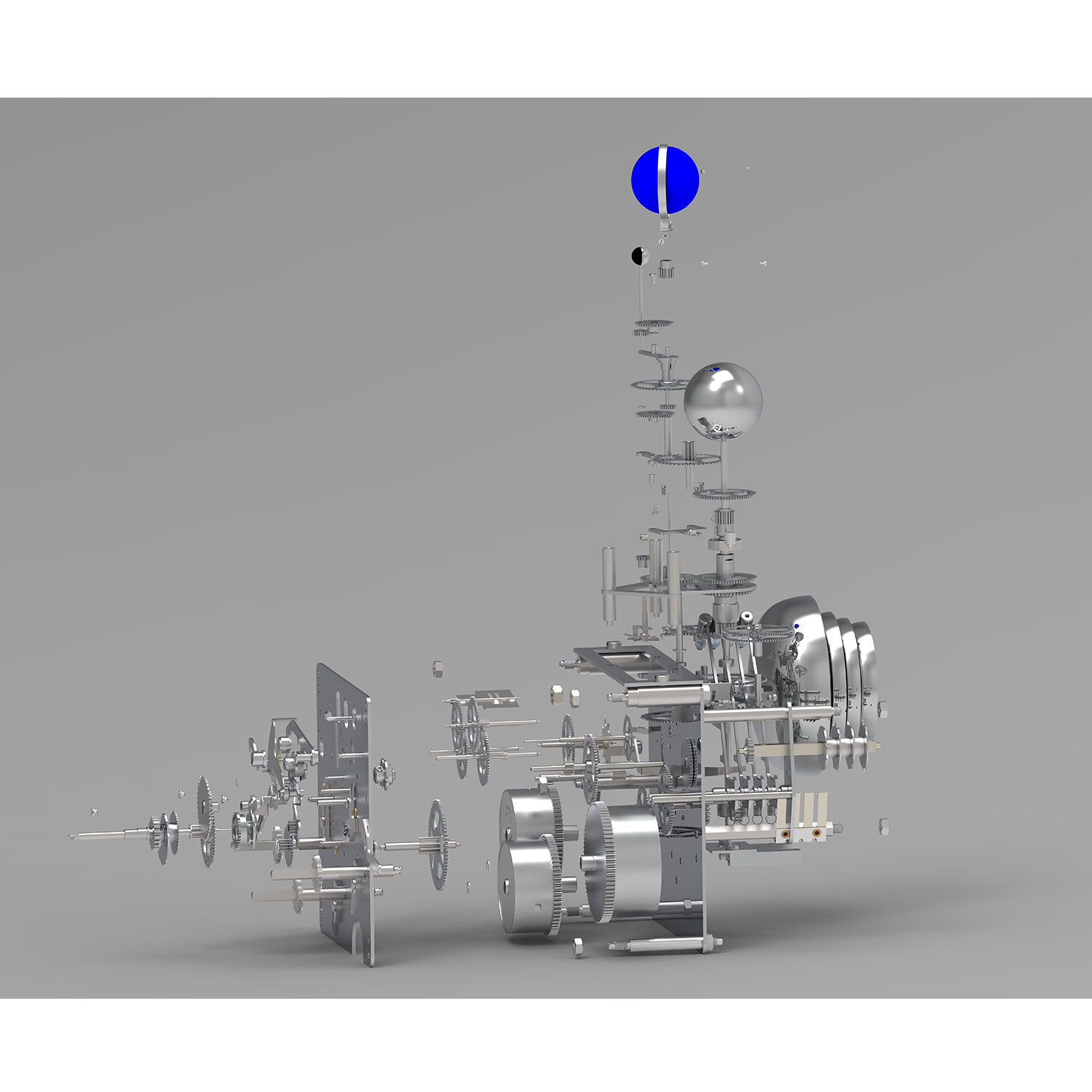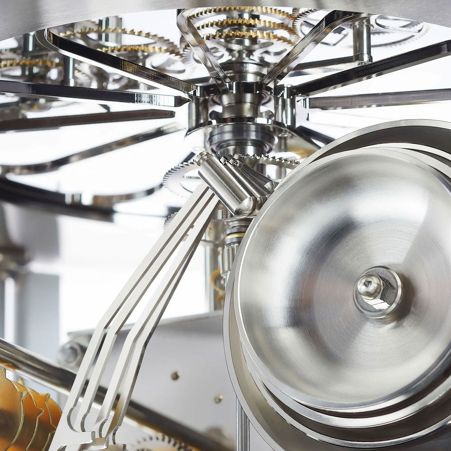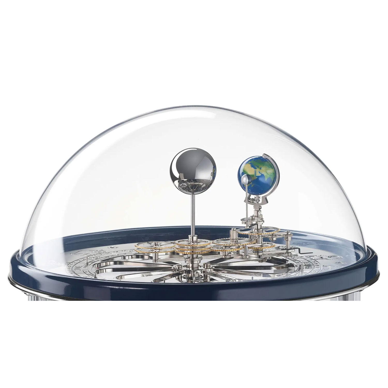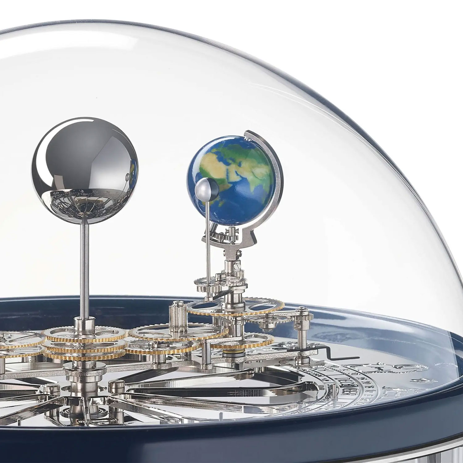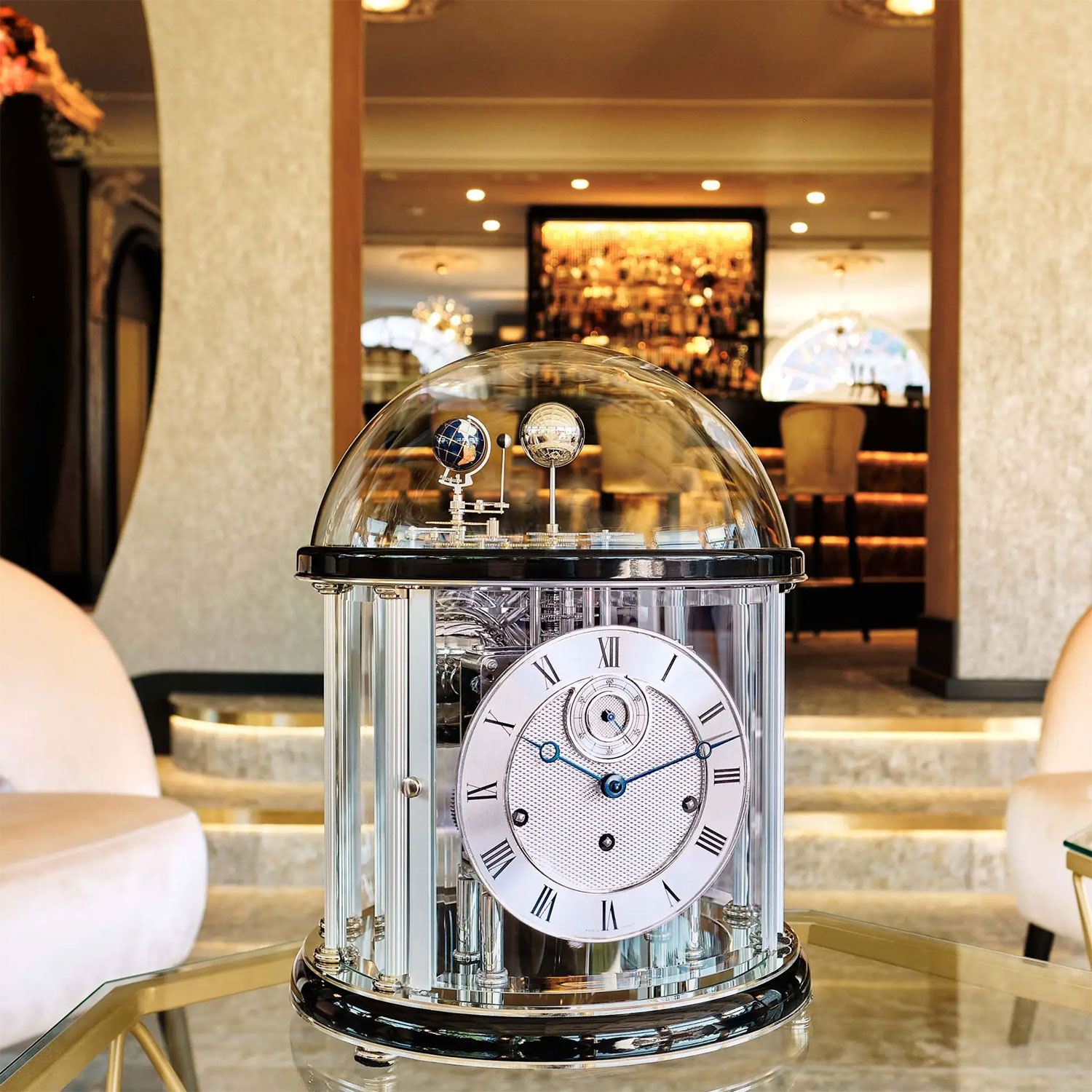 The Tellurium 22823-V10352 in chrome/green from Hermle shows the Earth’s orbit around the sun once a year, with the Earth rotating around itself once every 24 hours. At the same time, the moon orbits the earth once every 29 1/2 days and rotates around its own axis, making the individual phases of the moon visible from the earth. The earth passes through the 12 signs of the zodiac, the months and days, which can be read on a flat dial. The movement of the Tellurium 22823-V10352 from Hermle has 8-day 4/4 Westminster strike train on four polished bells. Seconds in the power train, spring balancer, 11-jewel Swiss echappement, polished plates, automatic night shut-off of the strike train. Milled depictions of the 12 signs of the zodiac on an openwork, polished rosette roundel. Milled calendar depiction of the month and day. Tellurium-Rotating arm with hands and depiction of the sun, moon and earth.