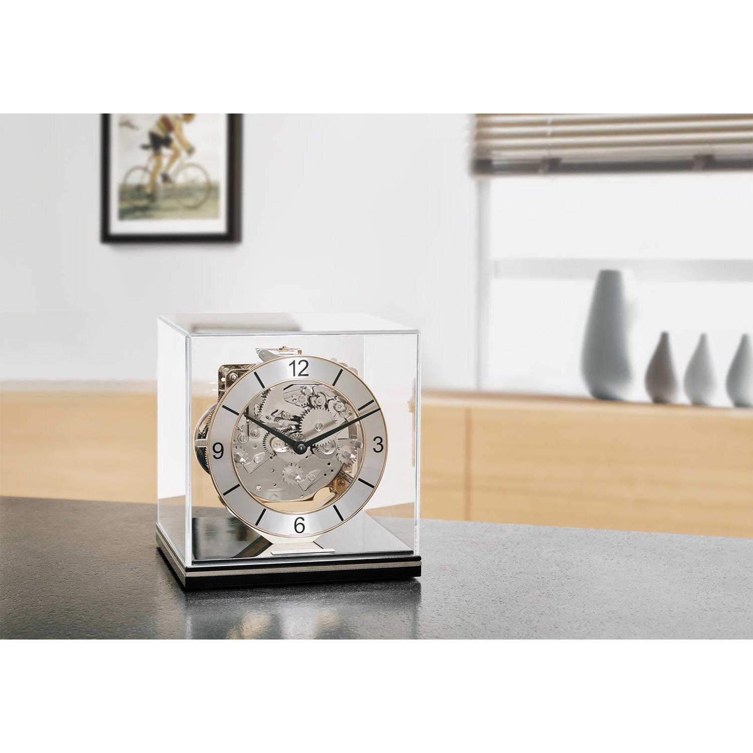Der hochwertig verarbeitete Sockel überzeugt durch seine feine Schleiflackoberfläche sowie eine eingelegte, polierte Metallader, die dem klaren Design eine subtile, edle Akzentuierung verleiht. Das massive Messingzifferblatt, poliert ausgeführt, wird durch einen geschliffenen Zahlenreif mit modernen arabischen Zahlen ergänzt und sorgt für eine klare, zeitgemäße Ablesbarkeit.