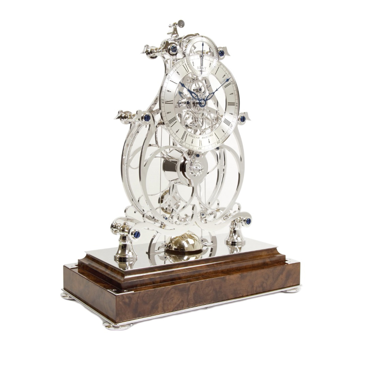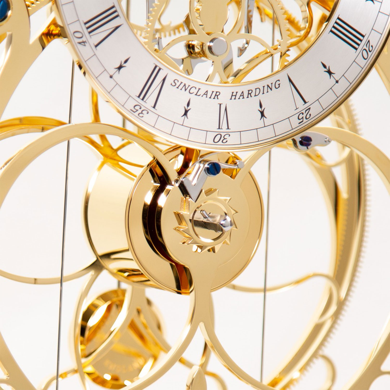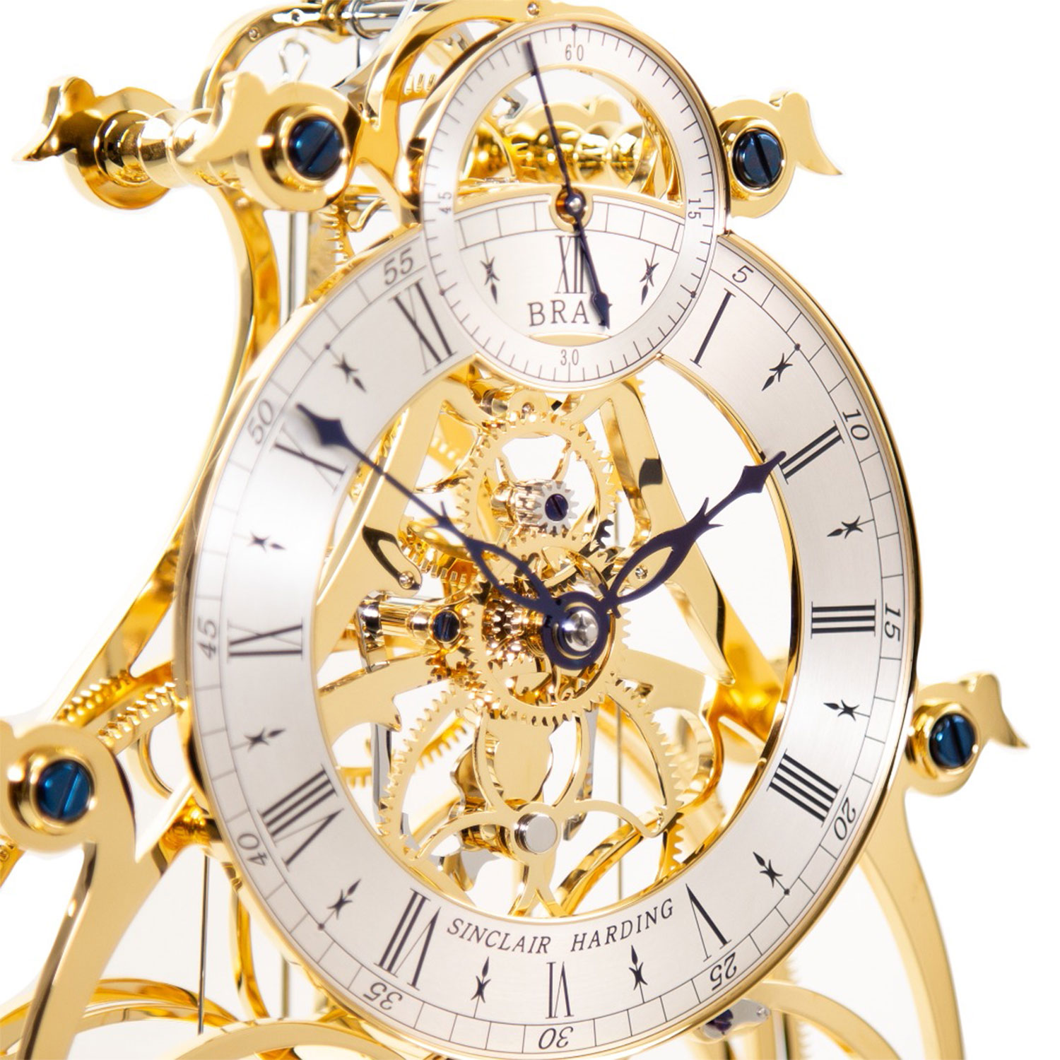 Diese skelettierte Tischuhr „Single Train Condliff (Passageschlag)“ mit einem einzigen Zug ist eine Hommage an James Condliff aus Liverpool um 1860. Sie besticht durch exquisite Überschneidungen des Räderwerks und der Platinen, die Sinclair Hardings Liebe zum Detail und zur Vollendung auf höchstem Niveau unterstreichen.