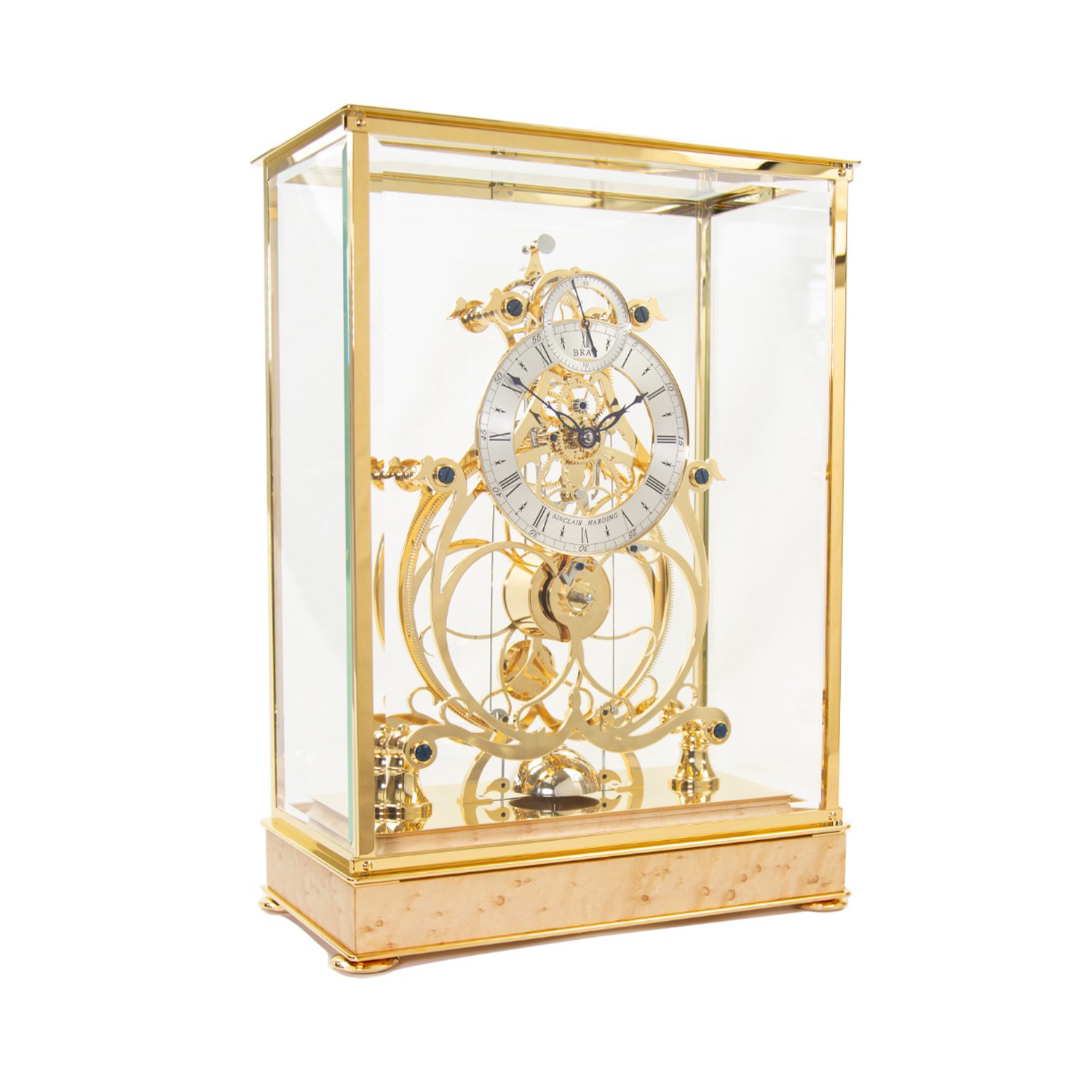 Das Uhrwerk ist auf zwei verzierten Säulen montiert und scheint über dem Sockel zu schweben, der aus einem Sandwich aus dekorativen Messingplatten und einer Auswahl von Holz oder Marmor besteht.