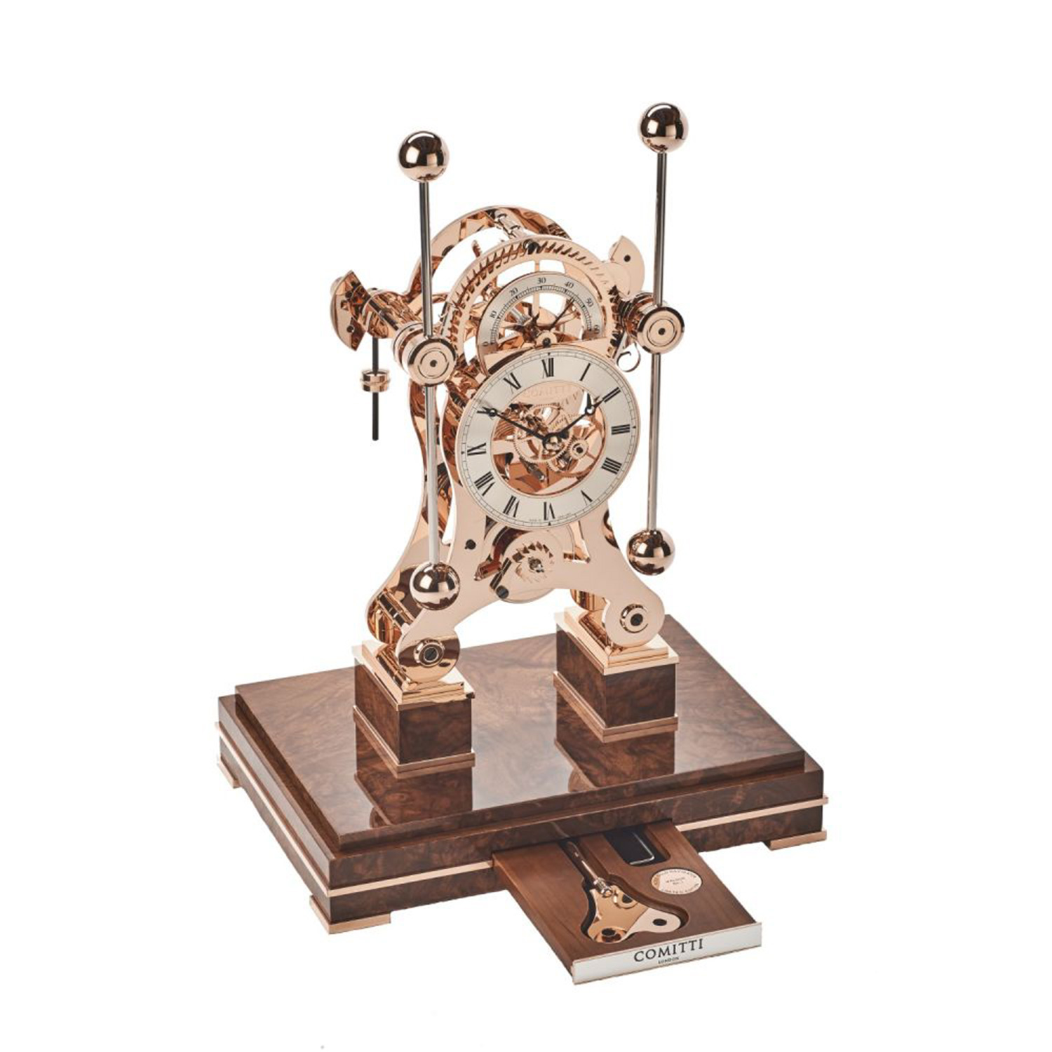Comitti Tischuhr „The Navigator“ Roségold – Edler Sockel aus Wurzelnussholz mit integrierter Schlüsselschublade