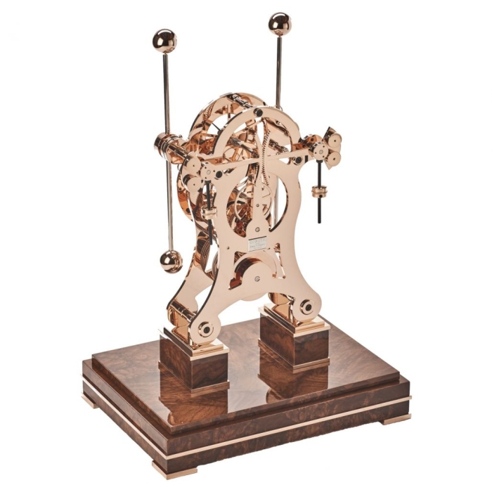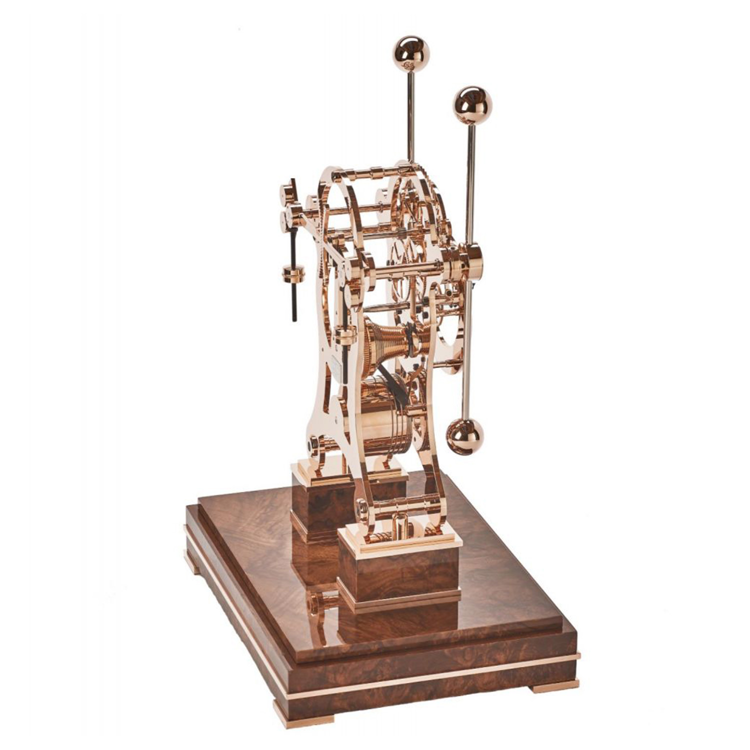 Jede Comitti The Navigator Roségold wird in feinster Handarbeit aus massivem Messing gefertigt und mit Roségold veredelt. Das versilberte Zifferblatt mit römischen und arabischen Ziffern wird durch elegante Breguet-Zeiger und eine separate Sekundenanzeige ergänzt. Der präzise Uhrmechanismus ruht auf einem polierten Wurzelnussholzsockel mit integrierter Schlüsselschublade und ist durch einen kristallklaren Glasschirm geschützt.