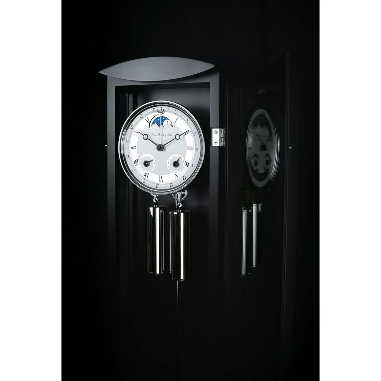 Im Inneren arbeitet das hochwertige Hermle Seilzugwerk W0058, das durch fein gearbeitete Seilrollen und Gewichtesowie eine äußerst stabile Kraftübertragung überzeugt. Das aufwendig gestaltete Zifferblatt bietet eine besonders übersichtliche Anzeige mit großem Datumsreif, Monatsanzeige und klassischer Mondphase – funktional wie ästhetisch auf höchstem Niveau.