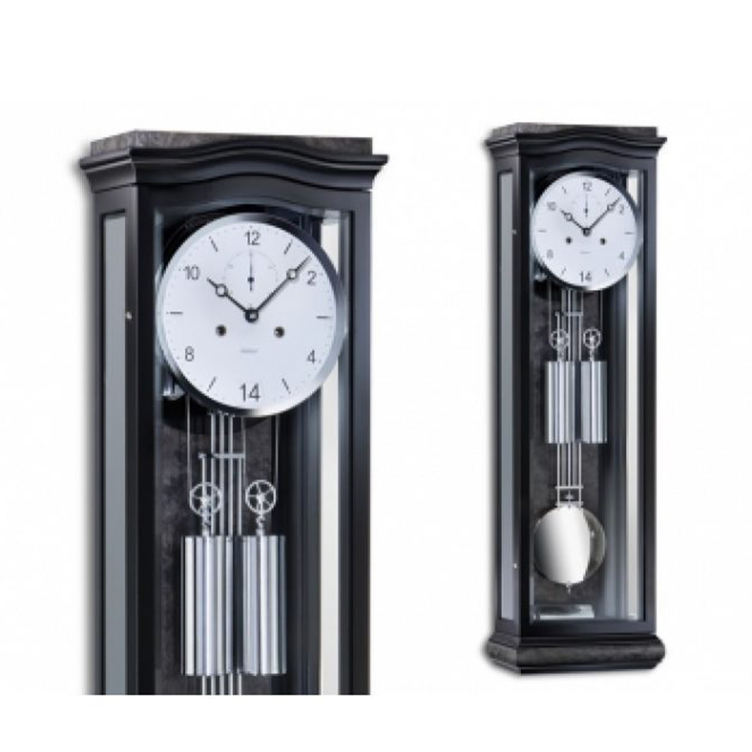 Die Wanduhr 2593-96-01 „Aurora“ von Kieninger präsentiert sich in elegantem, flachem Design. Der schwarze Schleiflack wird durch Akzente aus grauem Wurzelfurnier im Sockel, Kopfteil und Werkesockel stilvoll ergänzt. Die Uhr verfügt über komplett facettierte Gläser sowie ein Schlüsselfach mit Druckverschluss im Sockel. Das klassische Zifferblatt mit einer Größe von 20 cm verfügt über arabische Zahlen, eine Großdatum- und Sekundenanzeige sowie gefräste Breguetzeiger. Das hochwertige Kompensationspendel mit Feinregulierung und Pendelskala sowie alle sichtbaren Garniturteile sind verchromt.